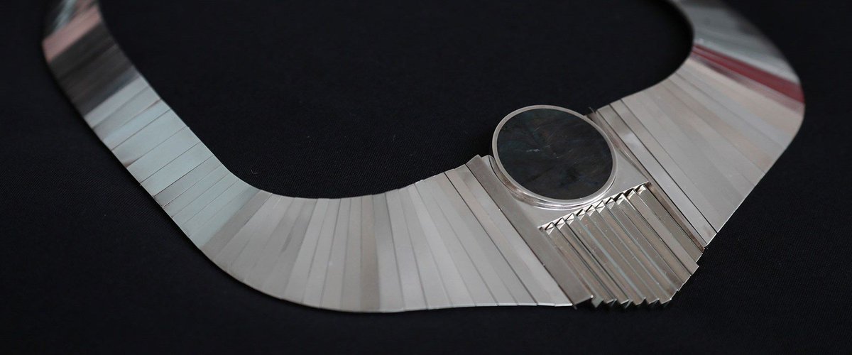 Dorothy Hogg is internationally recognised as one of the most important designer-jewellers of the last fifty years. This articulated silver necklace encapsulating a large labradorite disc is one of her earliest works. Read more about it here: https://buff.ly/2rGtGKm pic.twitter.com/UjmSCUeI7z