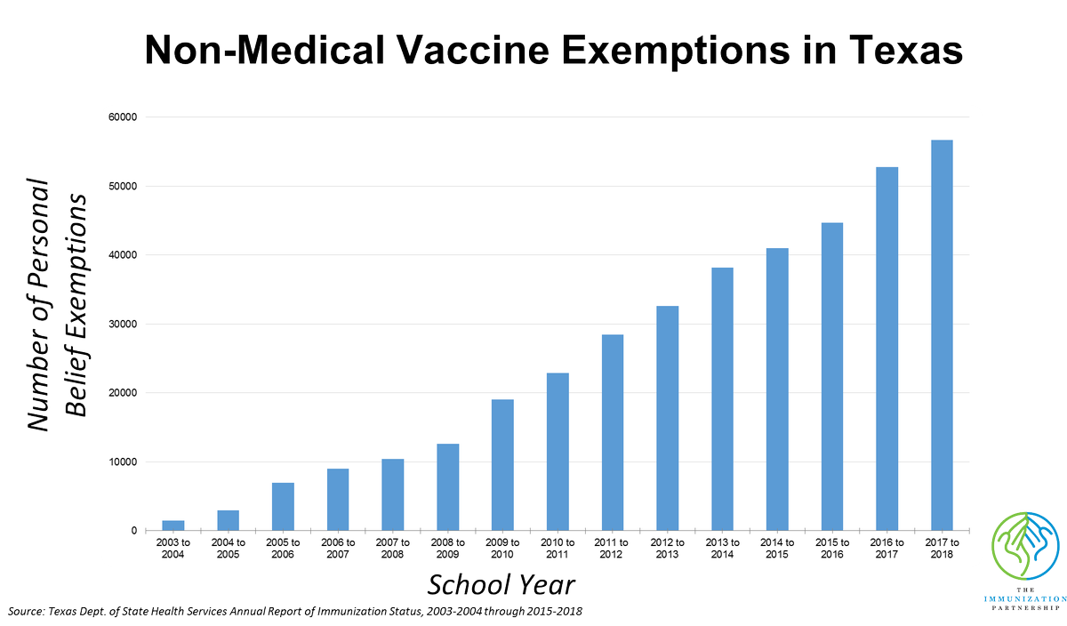 NEW: Awful rise of #Texas pediatric non-medical #vaccine exemptions (courtesy @Immunize_USA). Now 56,000+ the numbers don't even consider the est 300,000 homeschooled children. Lives placed in danger from #measles, other outbreaks, due to phony antivaccine lobbying. #VaccinesWork pic.twitter.com/ykAlL1q5j2