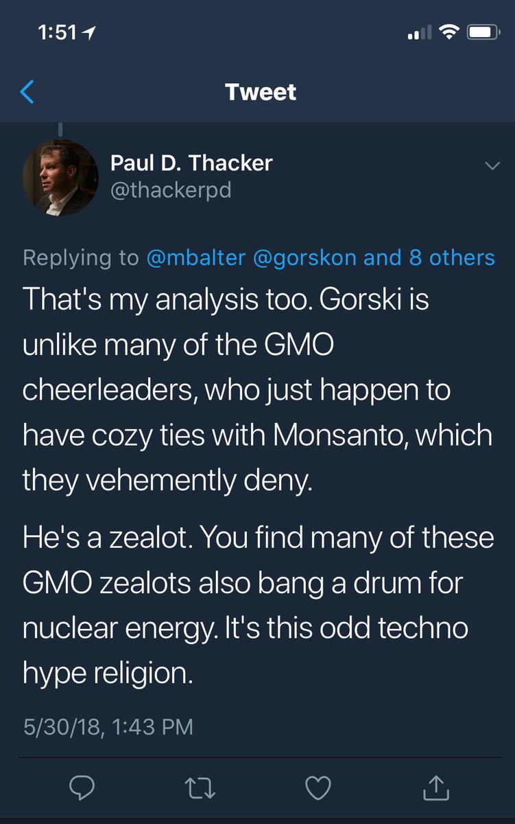 I never accused Thacker of being antivax but he is definitely anti-GMO. Of that there is no doubt. Anti-GMO activists frequently disingenuously conflate corporate IP issues and GMO science, and Thacker delights in sliming good scientists.