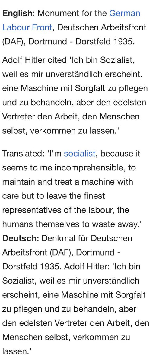 How odd is it that Nazis, specifically the German Labour Front, made monuments to honor Hitler’s love of socialism? After all, Nazis weren’t “real” socialists. Right?pic.twitter.com/l7ky5msFHb