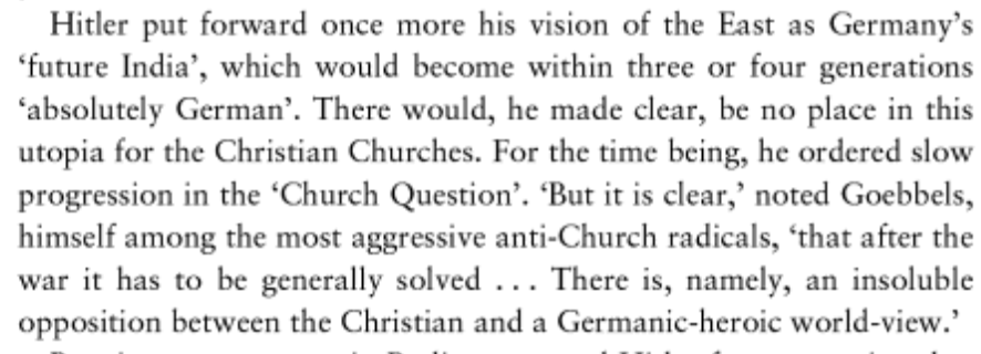 OTOH, Hitler clearly abandoned Christianity. However, the Nazi regime was very cult-like, and, although I'm not a historian, I see a lot of nature worship in Hitler's rhetoric. The "Germanic heroic world view" also had a lot of religion-like elements.