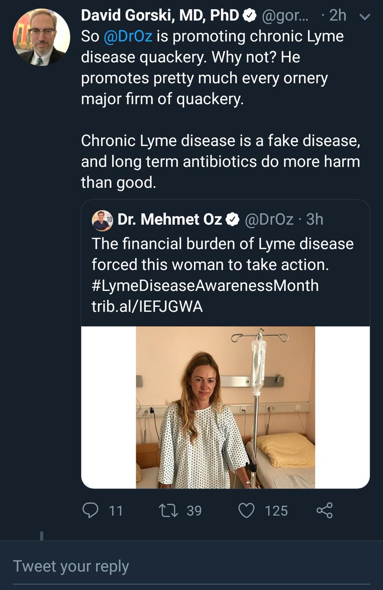 Chronic Lyme disease IS a fake disease. That doesn't mean the people who think they have it aren't having symptoms and suffering due to something. It's just not the tickborne bacteria that causes Lyme disease causing those symptoms. 1/ https://twitter.com/estarianne/status/1128763470634110976 …