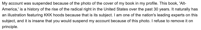 W...T...F...? Seriously? This is why @Twitter suspended @DavidNeiwert? Really? It's an even dumber reason than I thought. @jack? @TwitterSupport? You need to fix this!https://twitter.com/DavidAstinWalsh/status/1138500421042024455 …