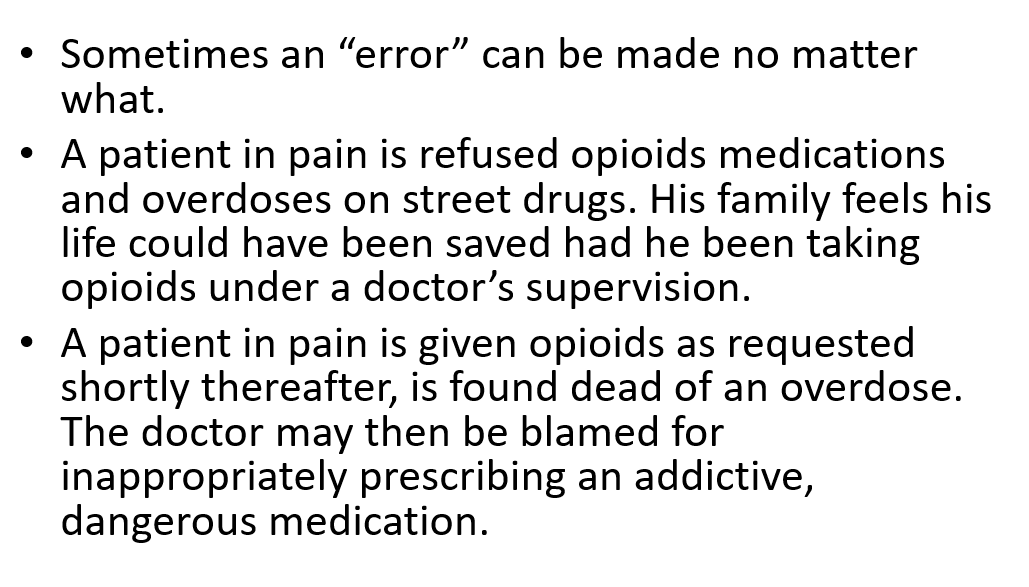 Yes! and 3. You assessed the pt as not needing opioids, they became dysregulated later at home due to pain, and suicided We could have a really long discussion here on whether a bad outcome is necessarily a medical error, but that maybe distracts from more likely error modes /2