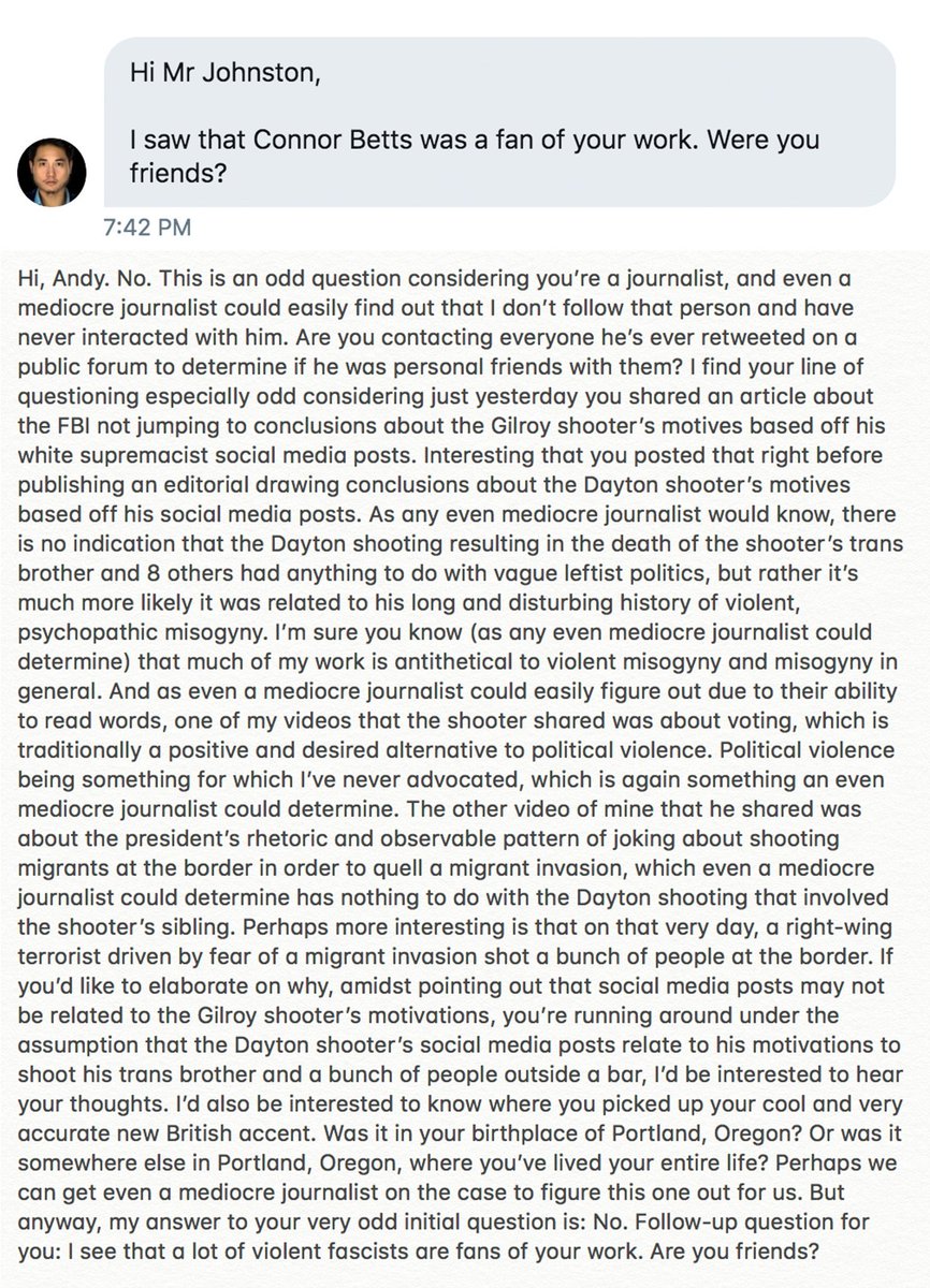 I mean, just yesterday he was DMing antifascists to see if they had a connection with the Dayton shooter and then ignoring their responses as he soon a conspiracy theory to blame antifa for inspiring the shooter.https://twitter.com/mishmei/status/1159354956941422592 …