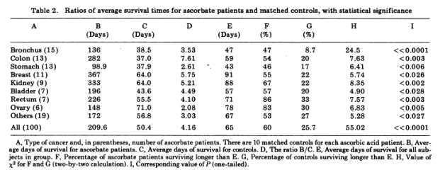 Intravenous vitamin C and cancer. This study by Linus Pauling published in PNAS in the 1970s suggested a substantial survival benefit from intravenous vitamin C for patients with a terminal cancer diagnosis compared to historical controls. https://www.ncbi.nlm.nih.gov/pmc/articles/PMC431183/?page=4 …pic.twitter.com/qtoQNtqEIM