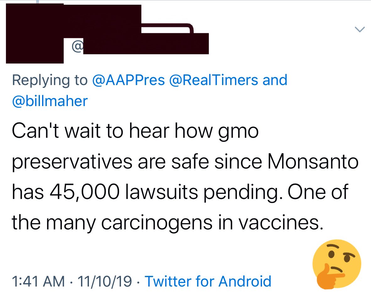 Some of the replies after the post by the AAP President are… beyond parody. For example, see this one—so adroitly mashing together multiple tropes into one antivaxx scaremongering!pic.twitter.com/eI6qaFoF5A