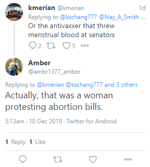 #antivaxxers are allergic to the truth. They will rewrite history just like other#deniers Here one claiming that the menstral blood thrown at California state senators during#SB276 hearing was actually anti-abortion protest, not#antivaxxpic.twitter.com/SfZAyfbrBQ