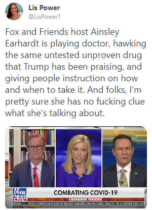That’s because (1) conspiracy theorists gonna conspiracy theory (so of course they’re pushing unproven drugs as though they definitely work) and (2) it’s always about the grift—always.https://twitter.com/LisPower1/status/1242278117638639621 …