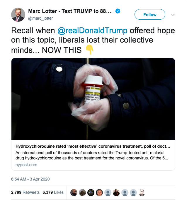 ADMIT IT. You're just against it because Trump said it could work. Never mind that 6 THOUSAND doctors surveyed found it to be the best solution. https://www.washingtontimes.com/news/2020/apr/2/hydroxychloroquine-rated-most-effective-therapy-do/ …