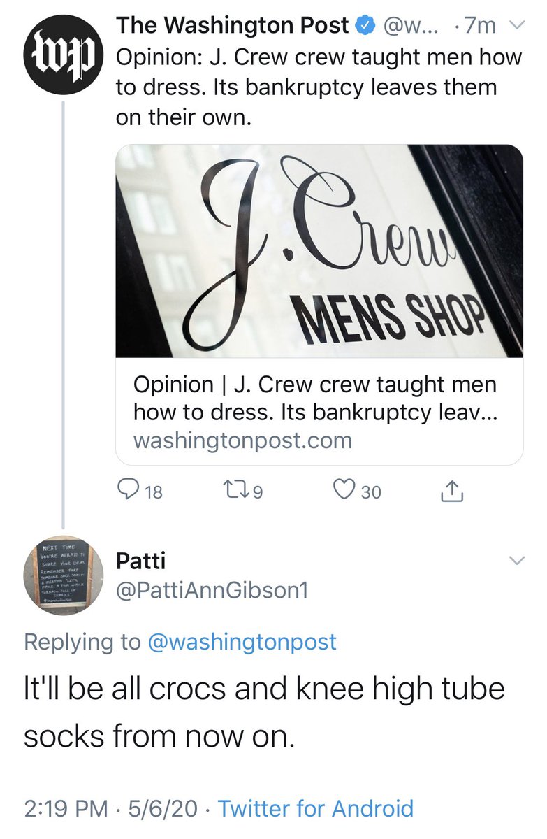 Best response so far. (Also, I’ll be fine. There’s still Land’s End and Eddie Bauer.)😏 https://twitter.com/washingtonpost/status/1258098772695027714 …pic.twitter.com/OzPlpG9e8l