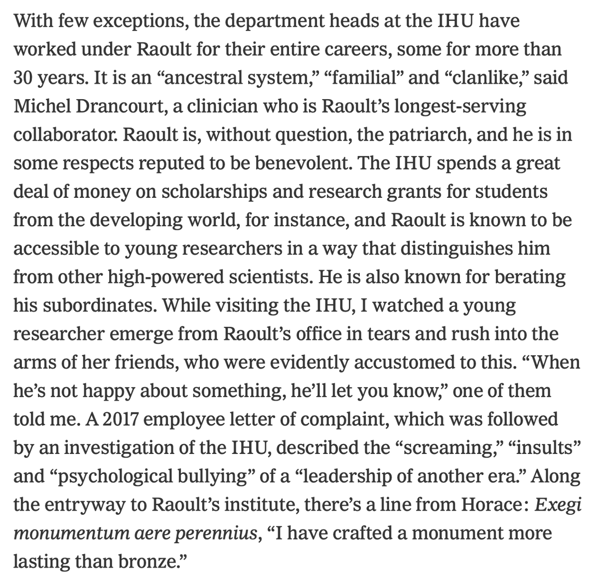 Raoult's history of sexual assault and culture of fear and bullying are glossed over in a single paragraph. https://forbetterscience.com/2020/03/26/chloroquine-genius-didier-raoult-to-save-the-world-from-covid-19/ …