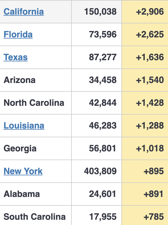 Radical reconfiguring of the top 10 states in total new case reporting. Today will be highest Saturday case reporting in USA since May 2. We are going backwards.pic.twitter.com/4YnBjRxUpj