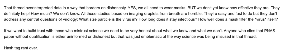 My issue with fervent mask enthusiasm in general has to do with the fact that the types of studies Dr. Osmundson mentions: these droplet dispersal studies don't address fundamental aspects of the virology, yet they are cited really uncritically as evidence of mask efficacy.