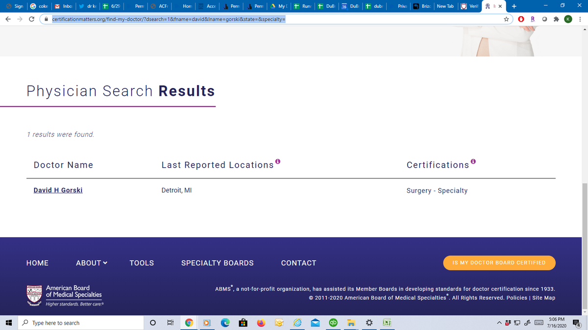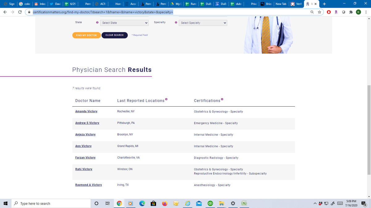 maybe if you just enter "victory" in the last name -and anywhere in the us? Nope.https://www.certificationmatters.org/find-my-doctor/?dsearch=1&fname=&lname=victory&state=&specialty= …