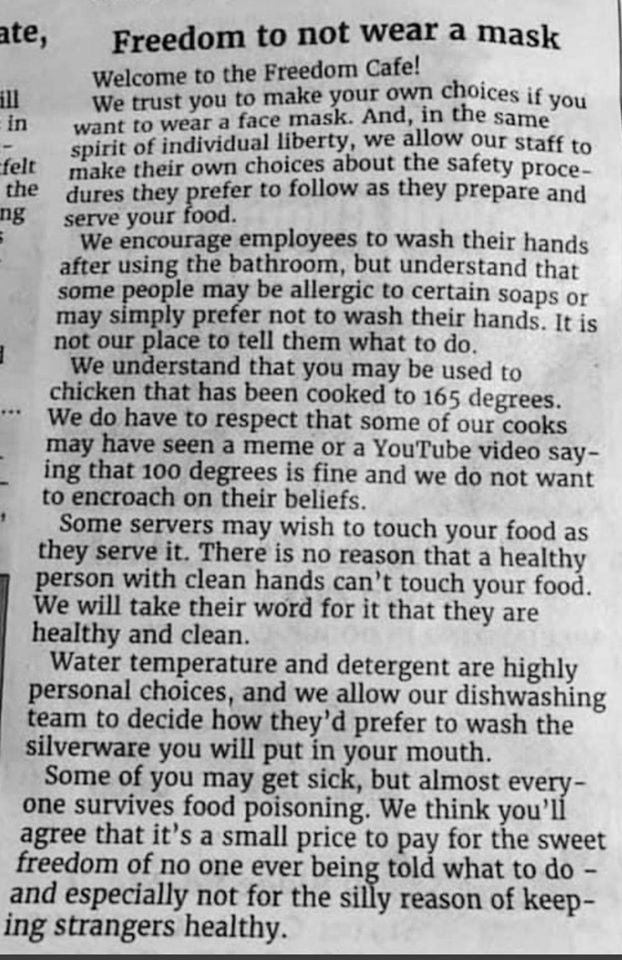 Or consider the public health requirements relating to sanitation. How many of the people who object to wearing a mask also object to laws requiring the use of toilet facilities?