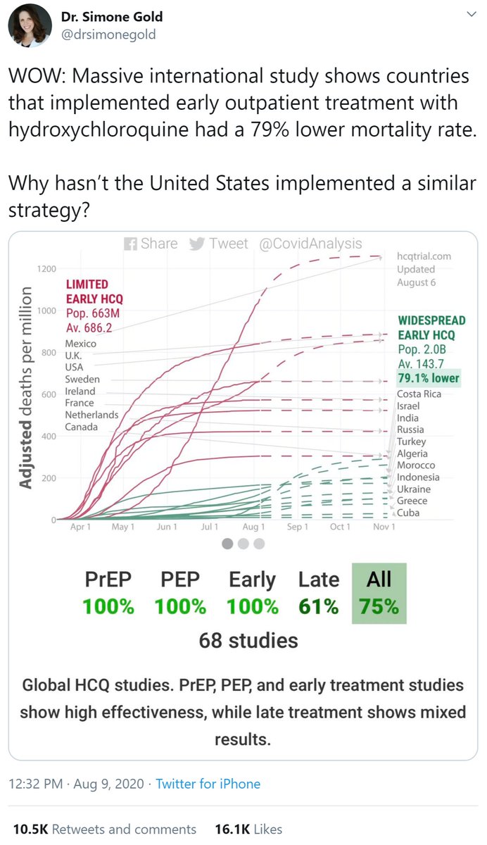 A risibly incompetent “study” published by someone claiming to be PhD scientists went viral. It claimed that countries that used hydroxychloroquine to treat COVID-19 had a 79% lower fatality rate than those who didn’t. Worst “science” ever.https://sciencebasedmedicine.org/hcqtrial-com-astroturf-and-disinformation-about-hydroxychloroquine-and-covid-19-on-steroids/ …