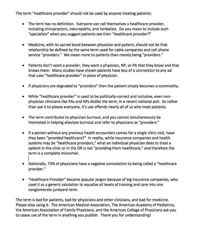 #MedTwitter we are doctors or physicians, not providers. “Provider” was a term first used by The Third Reich (Nazis) to devalue Jewish physicians as medical professionals. When someone calls you a provider -- help educate them.