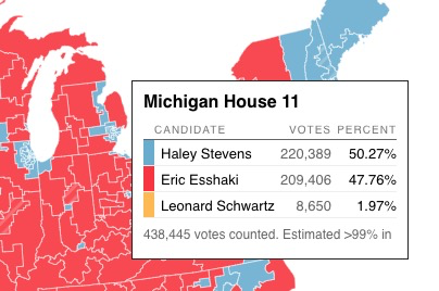 MICHIGAN: A bit of good news...Gary Peters is now just 6,900 behind John James (it was over 24,000 an hour ago), and Haley Stevens has gone from ~10K behind to ~11K ahead! Meanwhile, Biden's lead has grown to ~48K. https://results.decisiondeskhq.com/  pic.twitter.com/ujvzbVRZjt
