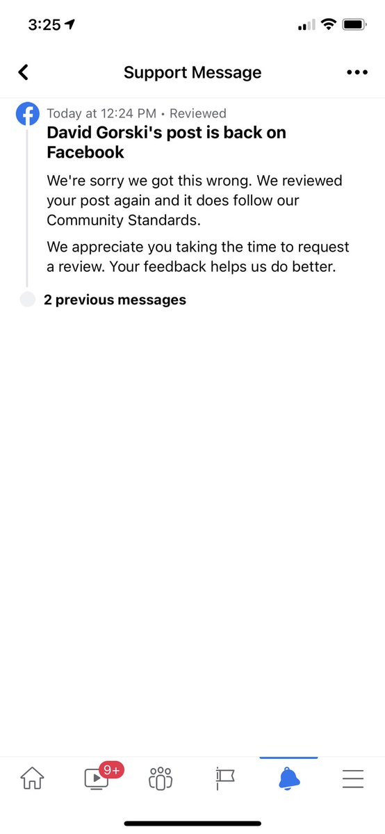 So, despite having reversed the decision on my supposedly having shared #COVID19 misinformation, FB still views me as having *two instances* of sharing material that “violates its community standards,” not one. (It should be zero.)