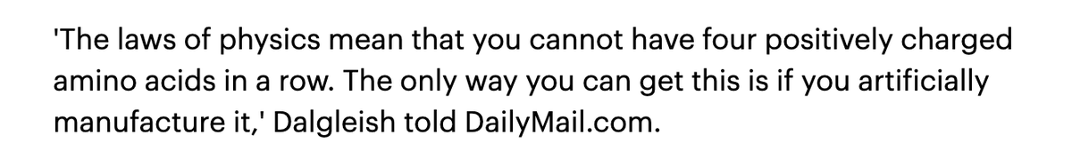 Authors state “The laws of physics mean that you cannot have four positively charged amino acids in a row. The only way you can get this is if you artificially manufacture it.” A 1/3 of all human proteins have 4 positively charged amino acids in a row❗ https://www.ncbi.nlm.nih.gov/books/NBK26830/