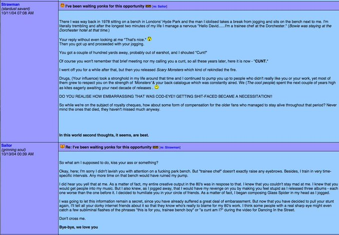 David Bowie was also King of the Shitposting Trolls, as you can see from this response to an angry fan. Respect. pic.twitter.com/fOJct4amJj