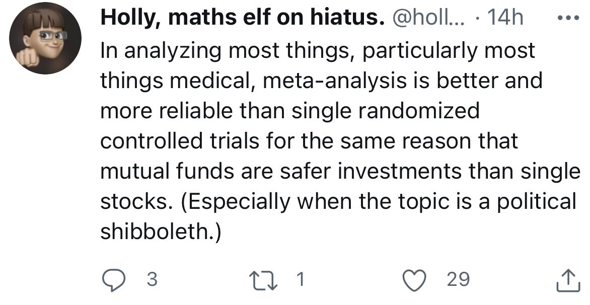 It never ceases to amaze me how many people seem blithely unaware that an inherent property of meta-analyses is: Garbage in, garbage out. Meta-analysis does not correct bias; it smooths out random errors. You can't turn a bunch or turds into gold through meta-analysis.https://twitter.com/mjaeckel/status/1416747673990926341 …