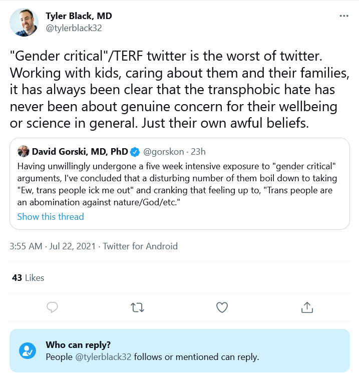 Tyler is far more 'ad hominem', in the sense of 'unfair or poorly evidenced judgement of an individual's behaviour'. Ask him what he bases his judgement of 'transphobic hate' on. I have actually criticised 'extreme GC' views using evidence & reasoning.https://twitter.com/NMacFa/status/1354787760041848838?s=20 …