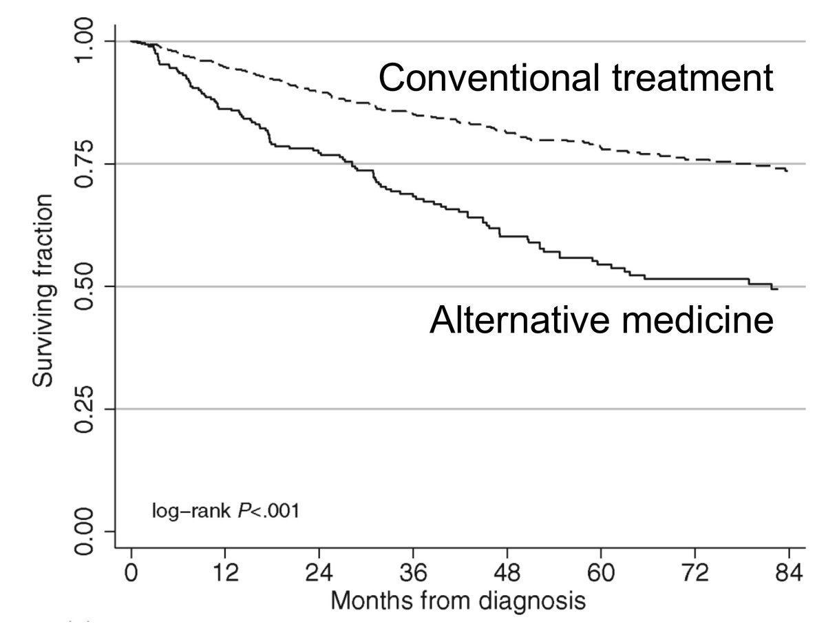This is useful data to quote when patients ask, "Why not chose alternative med over chemo?" Patients who chose alt medicine over conventional #cancer therapy faced a significantly higher risk of death. http://bit.ly/2BMNQFV  Great work by @YaleCOPPER @cpgYALE in @JNCI_Nowpic.twitter.com/CdHRQhKFsY