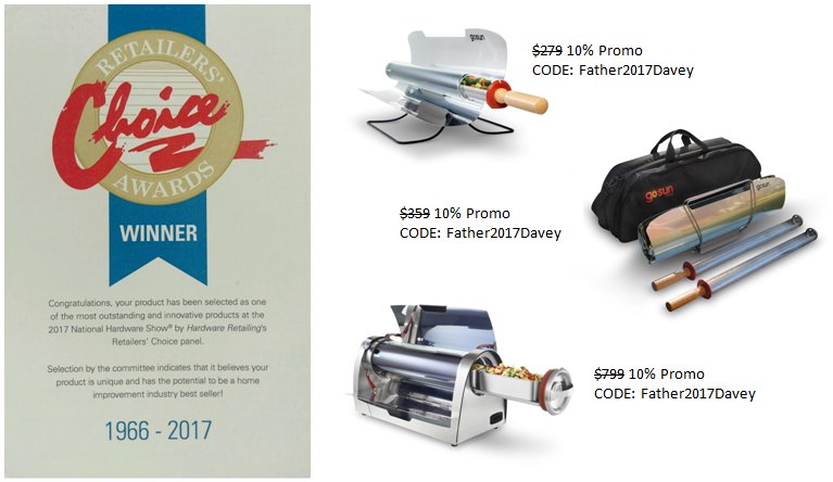 Last Chance Fathers' Day CODE:Father2017Davey for your Product Innovation Award Winning outdoor solar cooker from GoSun