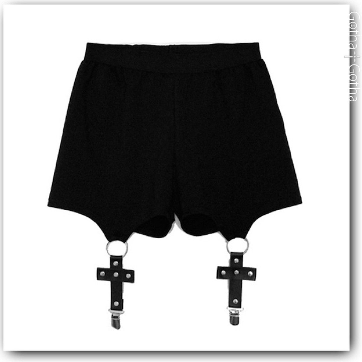 ♰CROSS×SHORT♰ クロスモチーフのニーハイ止めの付いた軽い履き心地のショートパンツ。 しっかりしたジャージ素材で、ウエストゴムFREEです。 ▷https://www.gothagotha.com/items/10613917