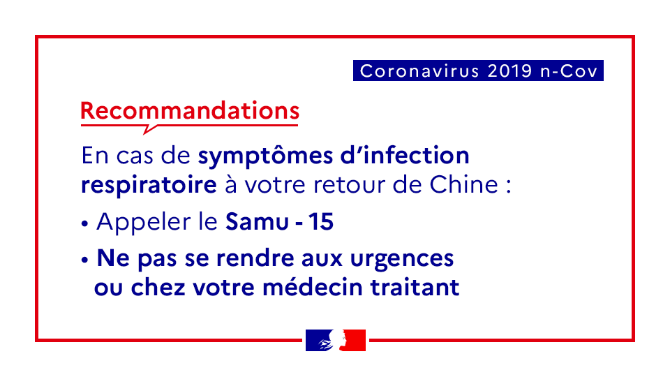 #CORONAVIRUSFRANCE] En cas de signes d’infection respiratoire (fièvre et toux, difficultés respiratoires), contactez le 15