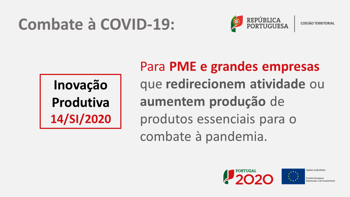 #Centro,#Lisboa e Vale do Tejo,#Alentejo e#Algarve, continua aberto o concurso para o combate à#COVID19. Um total de 46 milhões de euros, em fundos europeus, para micro, pequenas, médias e grandes empresas.#EstamosON Mais informação