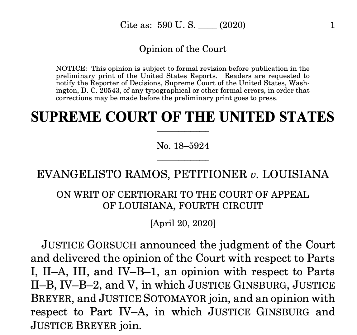 Note an absence of any references to Alabama in the ruling. Unfortunately, it is unclear whether this case applies to SENTENCING as well as CONVICTION. In other words, it may still be legal to send someone to death on a non-unanimous vote for death AFTER a person is found guilty.