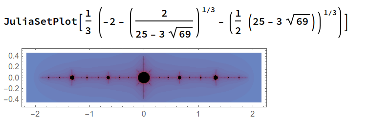 I've just asked sage to expand g/g' for the triply iterated Mandelbrot map, and put it into XaoS: $ xaos -speed 3.5 -maxiter 500 -palettef -anti -usrform '(((z^2+c)^2+c)^2+c)/8*((z^2 + c)^2 + c)*(z^2 + c)*z'pic.twitter.com/eWkPVF203N
