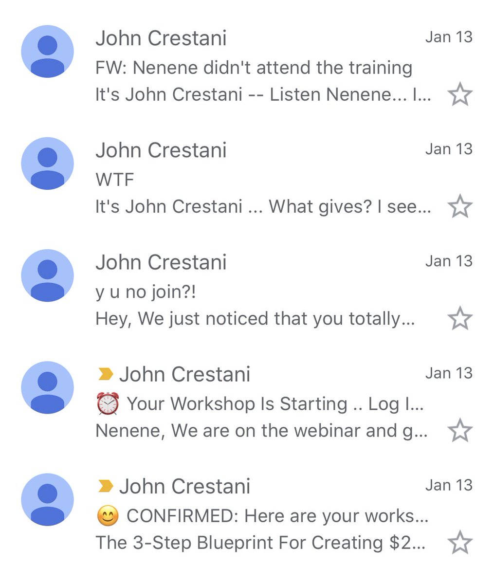 The email subjects alone for this multi-level marketing webinar that I didn’t sign up for and subsequently did not attend are ... a lot.pic.twitter.com/ijRJ751OEH