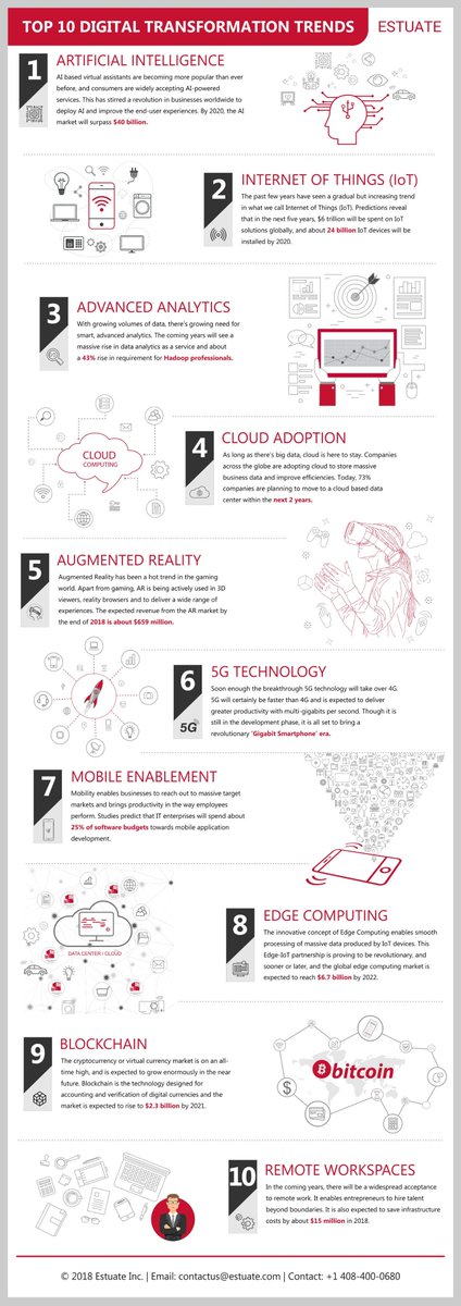 #DigitalTransformation Trends for 2018 and Beyond: 1.#AI 2.#IoT 3. Advanced#analytics 4.#Cloud adoption 5.#AR 6.#5G technology 7.#Mobile enablement 8.#EdgeComputing 9.#Blockchain 10. Remote workspacepic.twitter.com/HZQ9v0Ix4X