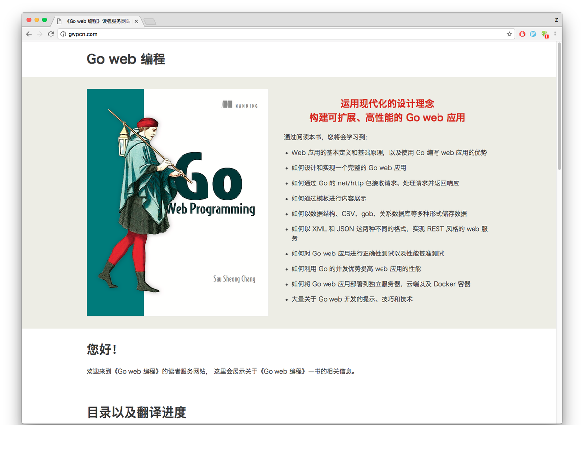 《Go web 编程》读者服务网站正式上线:http://gwpcn.com/ 网站目前公开了《Go web 编程》的介绍信息、翻译进度、相关资源……当然,还有说好的爆照(滑稽笑)~pic.twitter.com/m8R2UJoGsE