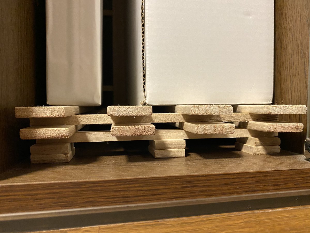 こんな感じで床から離してます。 スノコが長いので、ノコギリでカットして、カットしたものをスノコの基壇にして床から7センチ程上げて隙間開けて置いてます。 分厚いのは総重量5、6キロの写真集。あと大型本は頁めくりの指紋が残るの嫌だから手袋して見てます。笑pic.twitter.com/9eyLZeILaq