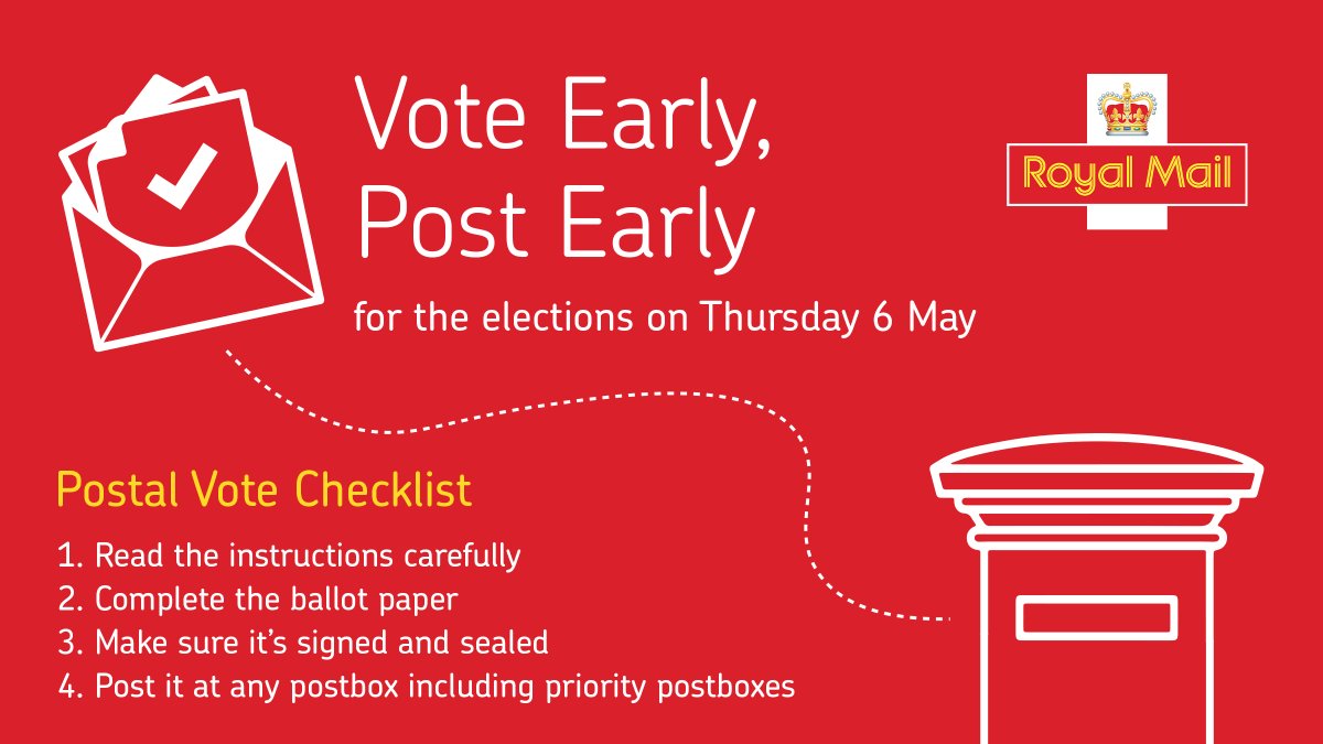 Royal Mail will be collecting from many post boxes even on Bank Holiday Monday and recommend that voters post their completed ballot packs by Tuesday 4 May. Ballot papers can also be handed into polling stations and local authorities on Thursday 6 May before 10pm.pic.twitter.com/inPJaqfilD