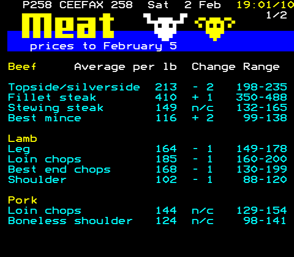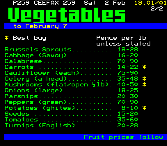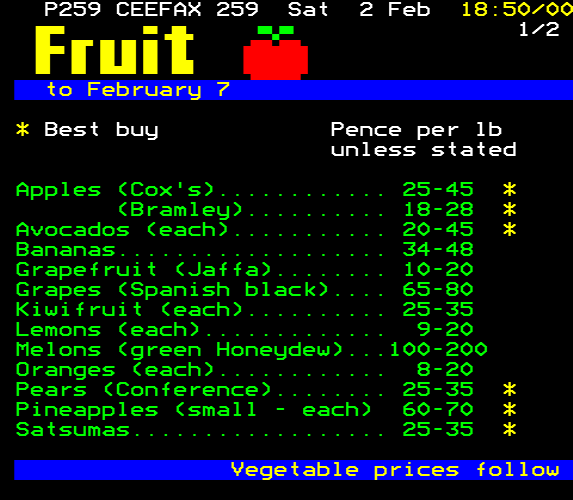 The Ceefax shopping section reads like a dull version of space trading computer game Elite. We have pictures of all the stuff we are talking about apart from vegetables, presumably because the artist wanted to draw a carrot but teletext doesn't have orange. (1985)pic.twitter.com/cI5lUSyMpO