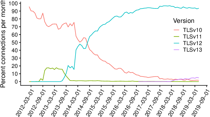 First talk: The Era of TLS 1.3: Measuring Deployment and Use with Active and Passive Methods by Johanna Amann (presenting) et al. Rapid and early adoption among big players on the server (Facebook, Google, Cloudflare) and client-side (browsers, mobile), slower in the long tail.pic.twitter.com/0Ka5RwyEXo