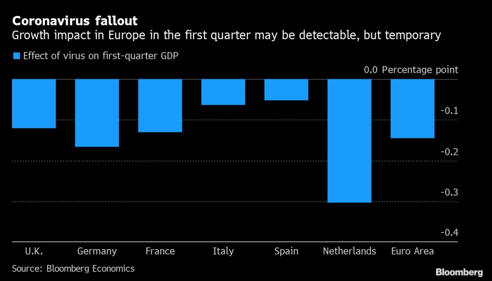 A global economic model on the fallout of the coronavirus shows a drag on euro-area GDP growth of between 0.1 and 0.2 percentage points in the first quarter https://trib.al/Sf4MADk pic.twitter.com/aiGfKA94iA