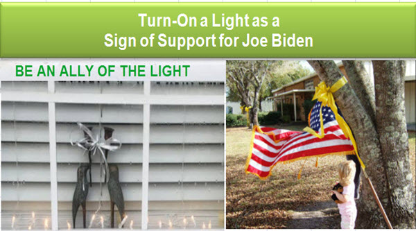 For those of us unable to have a yard sign, I'm encouraging others to do what we did in the window: Let's Turn-On a Light. When our country needed support we tied a Yellow-Ribbon....We did it before....let's do it again for @JoeBidenpic.twitter.com/aZaAqFk20v