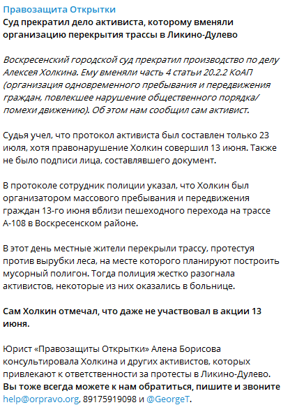 Опять преследование борцов с мусором в Подмосковье. Задержан активист из Воскресенска Алексей Холкин. Ему вменяют организацию перекрытия дороги А-108 в Ликино-Дулево 13 июля. Это повторное нарушение, следовательно, до уголовного дела остался лишь один протокол.
