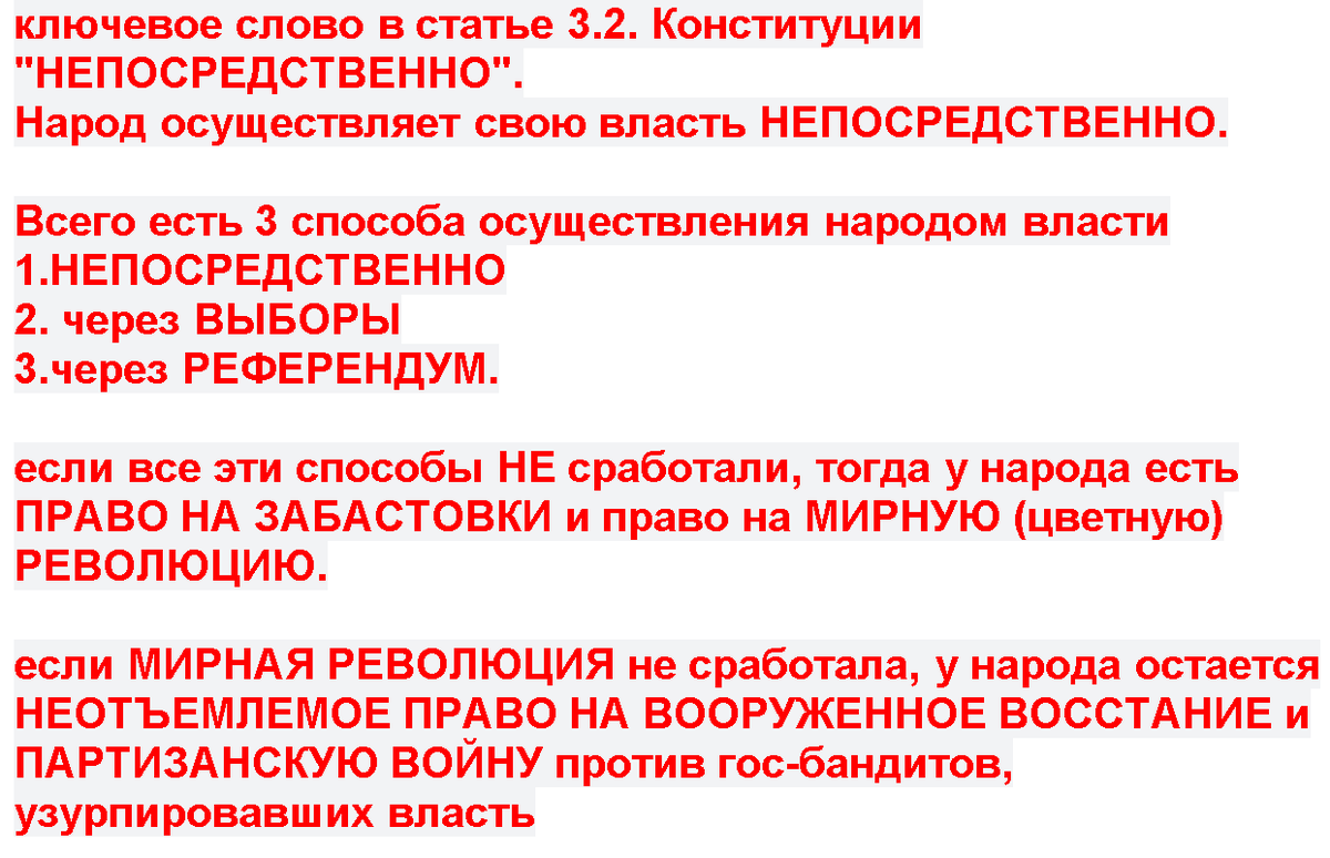 Способы осуществления народом власти 1.НЕПОСРЕДСТВЕННО 2.через ВЫБОРЫ 3.через РЕФЕРЕНДУМ. если все эти способы НЕ сработали, тогда у народа есть право на МИРНУЮ (цветную) РЕВОЛЮЦИЮ.если МИРНАЯ РЕВОЛЮЦИЯ не сработала, у народа остается НЕОТЪЕМЛЕМОЕ ПРАВО НА ВООРУЖЕННОЕ ВОССТАНИЕpic.twitter.com/JJqUwAgrdY