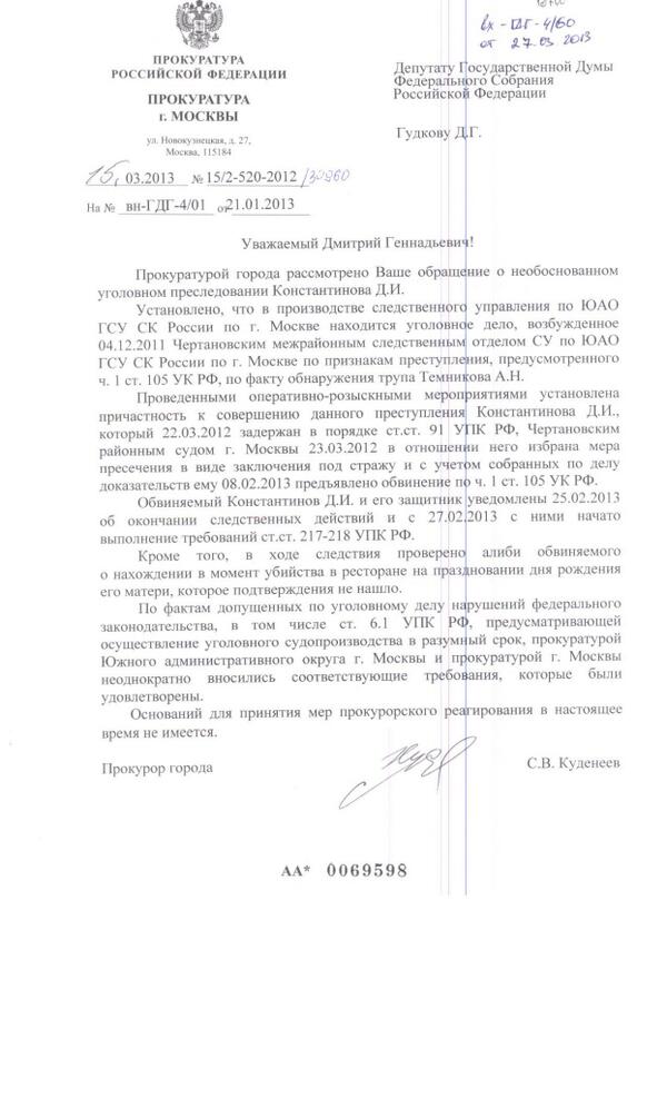 Ответ прокуратуры по Константинову. Жесть:алиби о нахождении обвиняемого на др мамы в день убийства не подтвердилосьpic.twitter.com/YxrZJXPEqq
