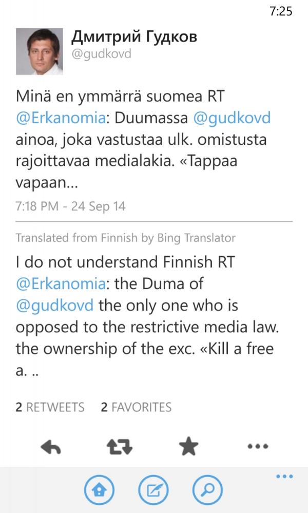 @gudkovd перевод: В Думе вы являетесь единственным, кто против законопроекта о СМИ и цитата. Cпасибо за комментарий! - End of conversation