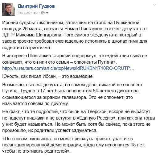 По иронии судьбы сын КГбеэшика и депутата Д. Гудков борется со ставленниками КГБ))