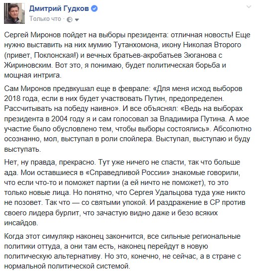 Кроме Миронова, на выборы президента пойдет мумия Тутанхомона и икона Николая Второго. https://www.facebook.com/dgudkov/posts/1649612925080141 …pic.twitter.com/OD1Rd3kDlo